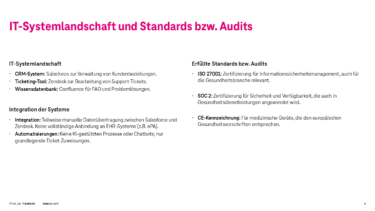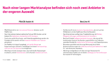 Die Detecon hat von HealoraTech vorab ein Datenpaket mit Unternehmensinformationen und Kennzahlen des Kundensupports erhalten. Darüber hinaus hat Detecon bereits eine Analyse der von HealoraTech vorausgewählten Anbieter generativer KI (PBxCB Assist AI, BecLine KI) durchgeführt.