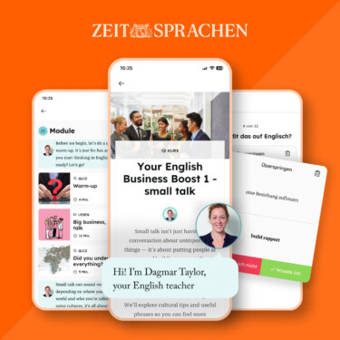 Mach dein Englisch fit für den Job: Mit der ZEIT SPRACHEN App Mit der ZEIT SPRACHEN App und den zehn Kursmodulen „Your English Business Boost“ trainierst du Englisch für Meetings, Präsentationen und Verhandlungen – damit du in jeder Situation sicher und überzeugend kommunizierst.